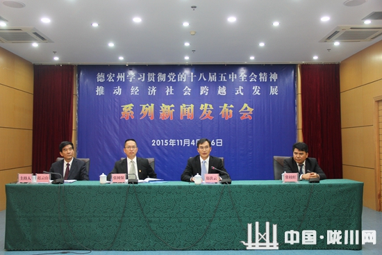 11月5日,根据德宏州委、州政府《关于举办2015年德宏州贯彻党的十八届五中全会精神推动经济社会跨越式发展系列新闻发布会》的安排部署,我县到州政府召开专场新闻发布会。