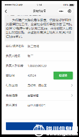 2、在场所登记页面登记场所名称、负责人姓名、负责人手机号、获取手机验证码并填写验证码,选择行政区划、街道,登记地点详址的信息,登记完成之后点击【确定】按钮。