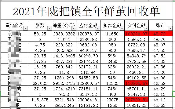 据了解,截至11月,德宏正信实业股份有限公司在陇把镇已收购鲜茧171.71吨,全县产量排名第一,平均张产43.04公斤,个人最高收230984.81元,户均收入23794.52元(全镇总收入7209740.8元,养蚕户303户)。