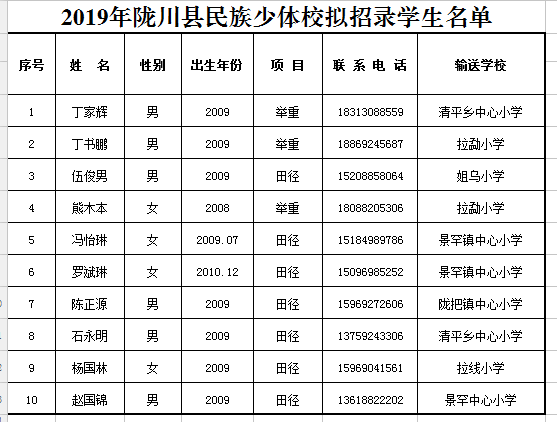 根据《德宏州人民政府办公室关于印发进一步加强运动员文化教育和运动员保障工作实施意见的通知》(德政办发〔2015〕28号)文件精神和《关于认真做好2019年陇川县民族少体校招生工作的通知》相关要求,我少体校已完成招生测试和试训工作,根据学校建设需要,按照择优选拔、宁缺毋滥的原则,经领导小组研究决定,确定拟录名单并公示如下: