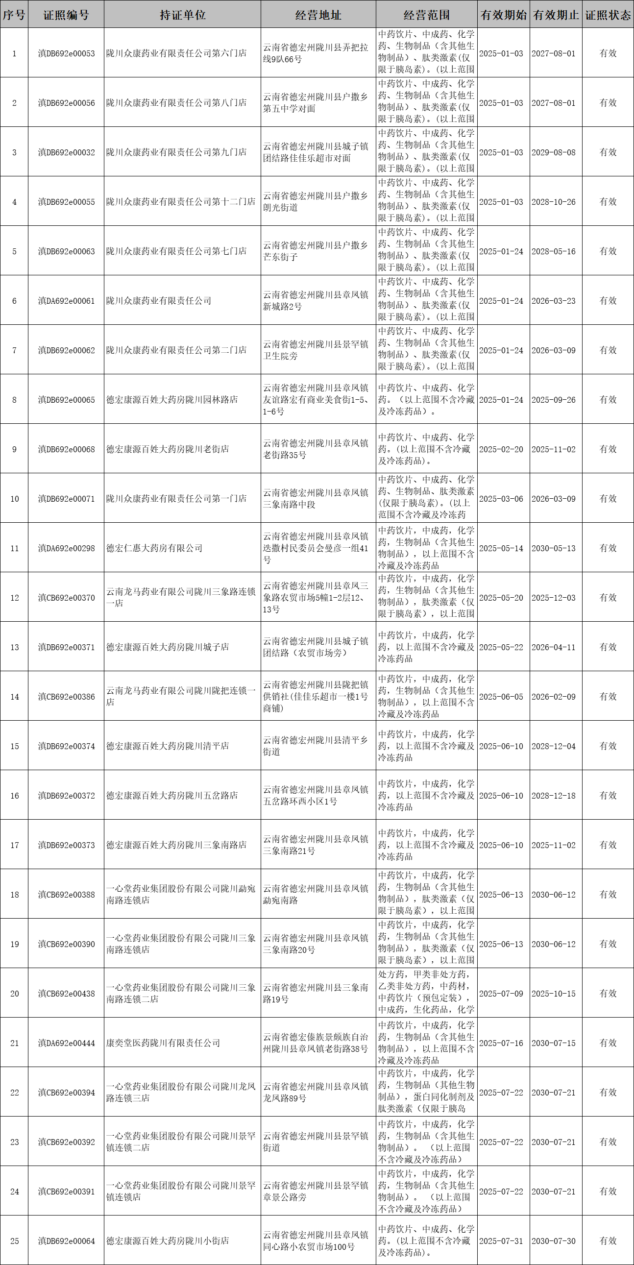陇川县药品经营许可2025年下半年公示表