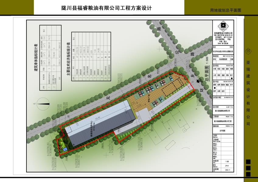 陇川县福睿粮油有限公司工程建设项目位于陇川县章凤镇工业园区弄转路西南侧。主要规划技术经济指标如下:规划总用地面积3702.5平方米,总建筑面积4023.33平方米,建筑密度34.8%,绿地率25%,容积率1.04,机动车停车位21个,非机动车停车位60个。
