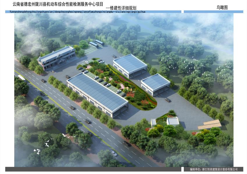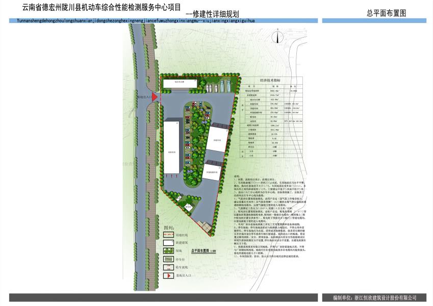 陇川县机动车综合性能检测服务中心建设项目位于陇川县章凤镇瑞章公路东侧。原主要规划技术经济指标如下:规划总用地面积9662.46平方米(14.49亩),总建筑面积2794.35平方米,建筑密度23.04%,绿地率23.8%,容积率0.46,机动车停车泊位51个(大车10个,小车41个);现主要规划技术经济指标变更如下:规划总用地面积9662.46平方米(14.49亩),总建筑面积2344.7平方米,建筑密度20.57%,绿地率26.95%,容积率0.4,机动车停车泊位44个(大车10个,小车34个)。