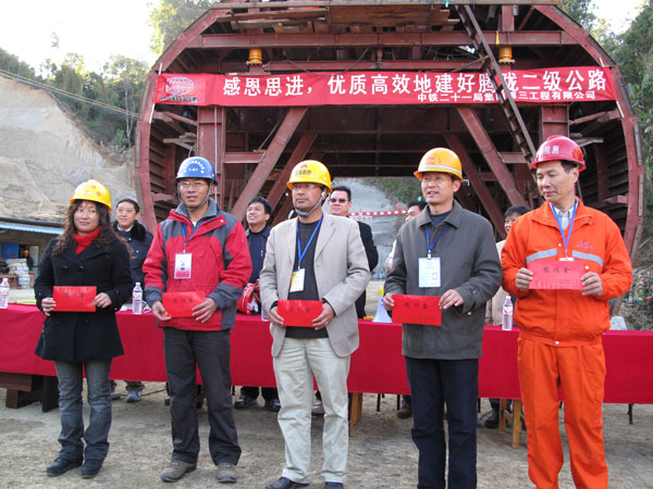 在户撒隧道进口工地慰问时,柳五三一行查看了隧道建设情况,柳五三要求施工单位要抓质量、保安全、抢工期,细化各项环节工作,有条不紊地推进工程建设,同时要千方百计地做好道路保通工作和环境保护工作。随后,柳五三还看望慰问了腾陇路第二监理合同段总监办和第7、8、9合同段项目经理部及云南航天工程物探股份有限公司户撒项目部,向他们致以节日的问候并赠送了春节慰问金。