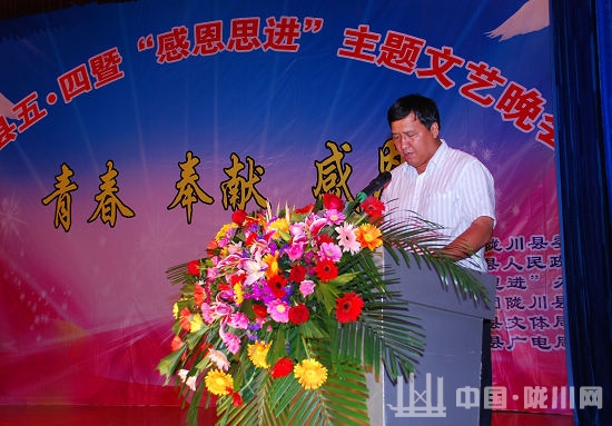县委常委、宣传部长何华在晚会上致辞。他指出,青年兴则国家兴,青年强则国家强,弘扬五四精神,投身跨越式发展是当代陇川青年的神圣使命。他希望社会各界特别是广大青年朋友,要通过开展“感恩思进”教育活动自觉增强知恩情、明是非、识大体、讲团结、守法纪、求进取的意识,勤奋学习、扎实工作,满怀感恩进取之心,满怀干事创业激情,以更加昂扬的斗志投入陇川各项建设;要把“五.四”精神转化为推动陇川跨越式发展的巨大动力,为推进富裕开放、和谐安宁社会主义新边疆建设贡献青春和力量。
