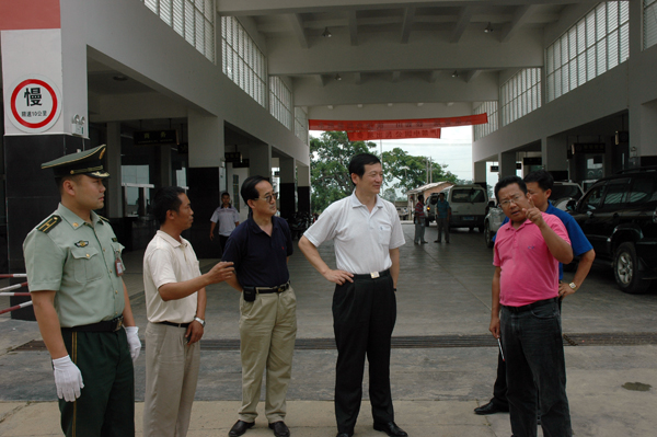 在拉勐通道,调研组一行实地查看了通道管理及联检楼建设情况,详细询问了边境治安管理及缅克钦邦对中方人员和货物进出管理的具体情况。
