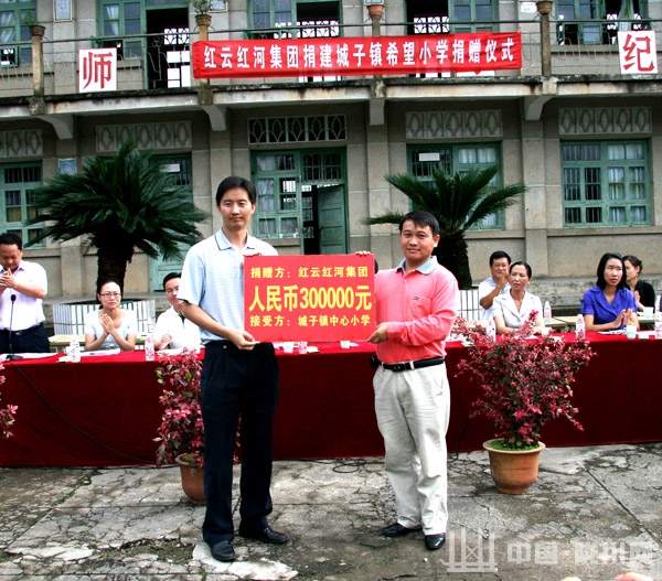 城子镇中心小学始建于1937年,是我县历史最悠久的一所学校,现有师生700多名,大部分是本地傣族,景颇族等少数民族学生。随着我县校点撤并步伐的加快,城子镇中心小学学生将突破1500人,急需新建教学楼和学生宿舍,以解决财力和建校的需要,面对困难,红云红河集团及时向该小学伸出援助之手,献出关爱之心,为城子镇中心小学捐款30万元人民币帮助修建教学楼。