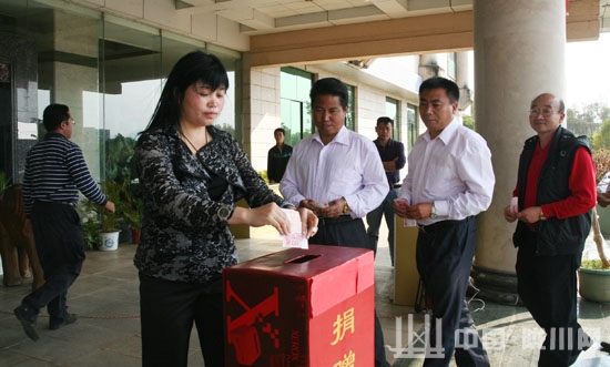 捐款仪式上,副县长张福鸾代表县委、县政府做动员讲话。张福鸾希望全县广大党员干部职工积极响应县委、县政府的号召,把支援灾区抢险救灾工作与当前开展的创先争优活动结合起来,充分发挥党组织和广大党员的战斗堡垒和先锋模范作用,积极支持灾区人民群众抢险救灾,以实际行动践行党员干部的先进性,帮助灾区群众渡过难关,尽快恢复生产生活,重建美好家园。