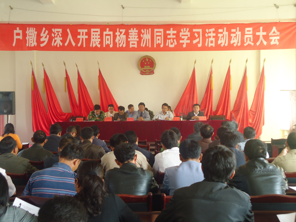 会上,乡长许本学领学了《陇川县委深入开展向杨善洲同志学习活动实施方案》和《户撒乡深入开展向杨善洲同志学习活动实施方案》,并对下一步户撒乡各党总支(支部)开展学习杨善洲先进事迹的专题讨论、办实事解难事主题实践活动、植树活动、组织生活会等专题活动进行了安排部署。乡党委书记韩永信在动员讲话中强调,学习宣传和实践杨善洲同志的优秀品质和先进事迹,是贯彻落实中央、省、州、县委的重要决定,对于广大干部特别是党员干部具有重要的意义和作用,全体党员干部要按照县委的部署,把创先争优活动与学习杨善洲先进事迹结合起来,把学习先进事迹同围绕全乡的中心工作结合起来,把学习先进事迹与做好各村、各站所的本职工作结合起来,要求全乡党员、干部职工认真学习杨善洲同志作为一名优秀的共产党员,60年来恪守敬业、一心为民,忘我工作,始终如一坚守共产党的精神家园,始终如一地践行执政为民的根本宗旨,始终如一地发挥老有所为的奉献精神。