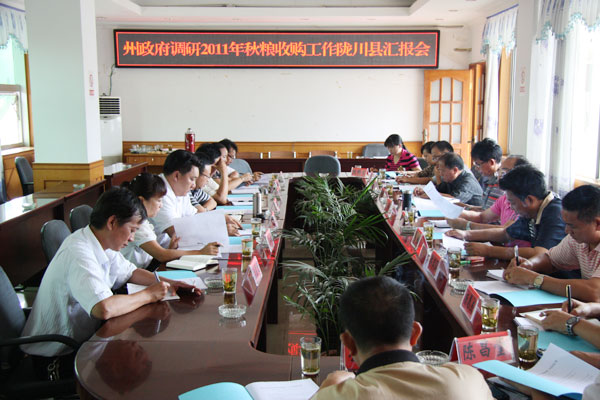 在汇报会上,调研组认真听取县委常委、副县长奎伟陇川县2011年秋粮收购工作情况汇报。在听取汇报后,调研组充分肯定了陇川县在秋粮收购,开展秋粮收购监督检查,处罚违法经营者,服务种粮农民增产增收,有力维护粮食流通市场秩序所做的工作。调研组要求:一是全县各相关职能部门要高度重视粮食流通监督检查工作,主要领导要亲自抓,分管领导具体抓,开展积极有力的督查活动,保障生产者、经营者的合法权益。二是粮食局要联合工商、质检、发改、交通等部门,在重点季节、重要时段开展联合检查,查处违法经营,震慑违法活动,维护市场秩序。三是要合理解决好糖粮争地问题,要做好基础设施和设备的前期工作,争取列入“菜篮子”工程。四是从供求关系上认清当前粮食发展形式,做好秋粮收购工作,确保粮食安全,做到农民增收、企业增效。