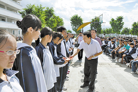 参加仪式的领导为受助学生发放助学金。