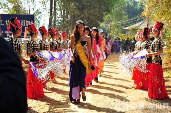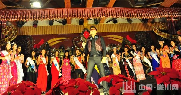 在广山景颇风情园,佳丽们与各地的记者们品尝了景颇族盛情款待贵客的绿叶宴后,来到目瑙纵歌场上,与陇川县各族群众一起跳起目瑙纵歌。铿锵有力的鼓点,上下挥动的长刀,银袍刷刷响,“哦然”震天外,大家不分彼此,合着鼓点一起起舞,景颇族源远流长的文化在这里得到了升华。