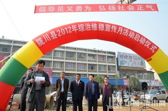 3月20日上午,陇川县2012年综治维稳宣传月活动启动仪式在县城章凤举行。县委常委、政法委书记、县综治维稳委主任肖章,县人大常委会副主任雷天四及县综治维稳成员单位负责人参加启动仪式,县委政法委副书记、县综治维稳办主任李腊布主持启动仪式。