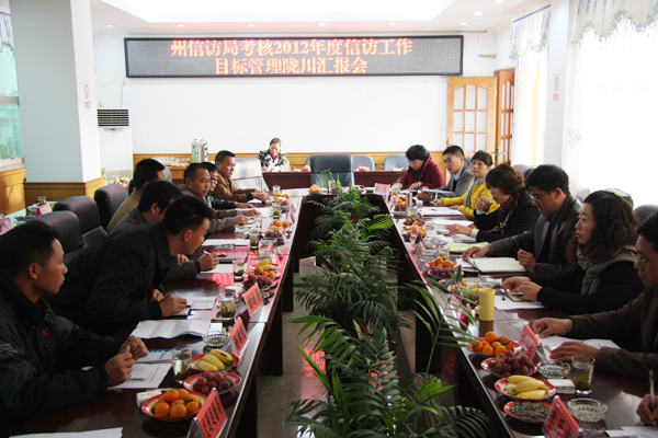 考核组一行参观了县信访局办公设施,翻阅了相关痕迹资料,并召开座谈会。会上,县信访局长就我县2012年信访工作目标管理进行了自评报告的。在认真听取报告后,考核组充分肯定了我县的信访工作,认为自评报告客观、实事求是,县委、县政府对2012年的信访工作高度重视,充分发挥联席会议统筹协调的作用,建立了矛盾纠纷排查化解机制。同时,高度重视对信访干部的选拔培养。就下一步工作,考核组建议:一是要在信息研判分析上下功夫,信息要及时上报;二是要在督办上下功夫,并且规范和使用管理特殊案件资金;三是要进一步畅通信访渠道,继续加强信访代理制和手机短信平台的运用;四是要加大对信访工作的经费倾斜和硬件设备的投入力度;五是要做好新形势下的信访“五个抓”工作,抓干部、抓源头、抓基层、抓感情、抓法律。