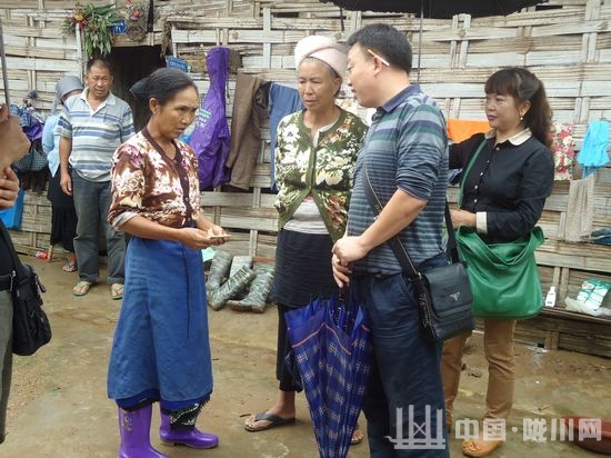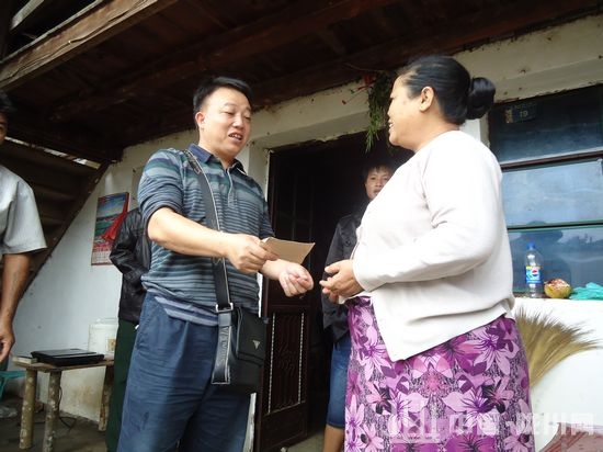 “咩阿雁(阿雁妈),县纪委的比孪(亲戚)来看望你们了!”章凤镇拉勐村委会拉相村党支部书记帅喊领着县纪委第一纪工委的同志冒雨走进水灾受灾户帅赛家。