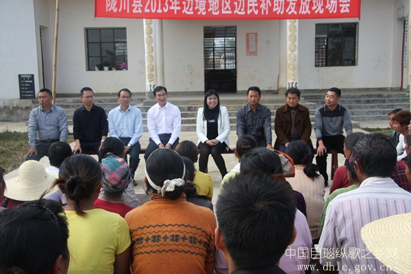 值此新春佳节来临之际,2014年1月14日下午,县长郑洪云率县委、人大、政协四班子领导驱车到达章凤镇拉勐村广宋小组、芒拉村芒岭小组参加陇川县2013年边境地区边民补助发放现场会,将党中央、国务院的温暖带到边境一线。