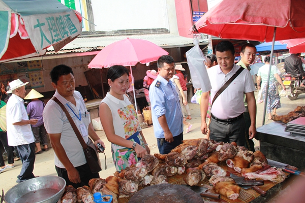为切实维护好端午节期间市场秩序和市场消费安全,让人民群众度过一个欢乐、祥和的节日。6月2日上午,陇把镇联合镇工商所、边防派出所、兽医站、计生站趁街天对陇把镇农贸市场、超市进行食品安全大检查,进一步督促经营者严格执行食品安全操作规范,消除食品安全隐患,确保饮食安全。