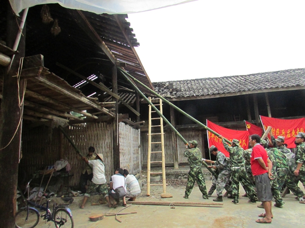 无情的“5·24”、“5·30”地震把尹老黑家的厢房墙体震得严重扭曲变形,无情的撕开了3米多长的裂口,并有墙土掉落,随时有倒塌的可能。大家看到此情此景,不顾火热太阳的烘烤,有的爬上房顶进行清理瓦片,有的用钉锤撬棍拆开椽檩,有的清理地上的碎瓦残砖、烂椽断柱,唯恐落后于他人,不一会功夫拆除危房完毕;尹老四家的厢房(木头穿斗房)被震得倾斜,大家就有的用钢绳拉、有的用坚实的竹竿顶,口中喊着整齐的“1—2—3”,房子也在“唧—唧”声中逐渐逐渐“正直”了起来;支援队伍还帮较为严重的滇小欢家清理了被震塌的土坯墙,搬出了剩余的墙土块。整个过程支援队员个个干得热火朝天。
