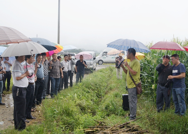 与会人员首先冒雨参观了户撒乡项姐和朗光村委会三块玉米种植实验示范地,技术人员从品种、长势、种植密度、种植波期、水肥情况等方面介绍了实验示范地的情况。