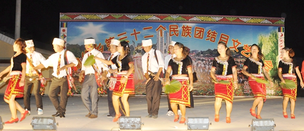 晚会中,各族人民自编自演,邦瓦村委会《景颇风情》、广瓦村委会《群众路线暖人心》、营盘村委会《天蓝蓝》、邦瓦村委会《党的政策好》等节目为观众献上精彩表演。热情洋溢的歌声,轻快的舞姿、豪迈的鼓乐等等一系列的精彩节目的上演,给热情的观众带来了一串又一串的笑语。阵阵掌声为“民族团结月”文艺联欢晚会增添了无限魅力。