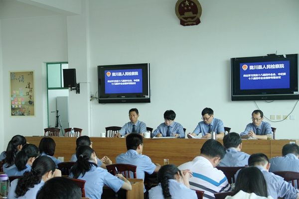 2014年11月3日下午,陇川县检察院召开全院干警会议,认真传达学习党的十八届四中全会和中纪委十八届四次全会精神。党组书记、检察长王莉琼主持会议并传达学习了《中共中央关于全面推进依法治国若干重大问题的决定》,党组成员、副检察长张福茂领学《中国共产党第十八届中央纪律检查委员会第四次全体会议公报》。