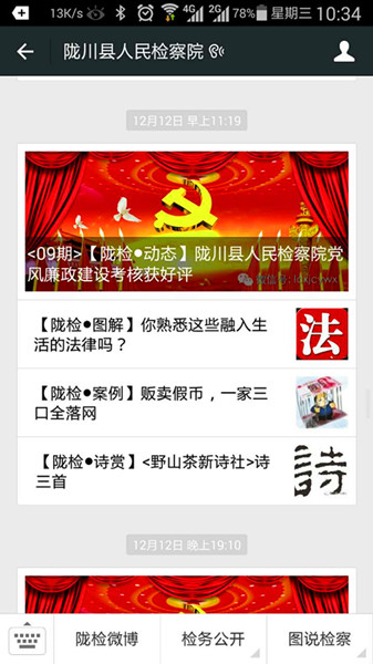 通过微信客户端扫描二维码或搜索陇川县检察院就可订阅陇检微信公众号,订阅后可及时收到陇川检察院通过文字、图片、语音、视频、图文消息等多种形式发布的非涉密检察信息、工作动态、检察文化建设以及陇川风土人情等方面的内容。在服务平台中可点击相关菜单关注“陇检微博”、“检务公开”、“图说检察”了解陇川检察动态、案件信息公开及检察工作职责等信息。订阅者还可通过服务平台向陇川检察院发送短信、语音、图片等多种形式的信息与检察官进行全方位、零距离的沟通互动。