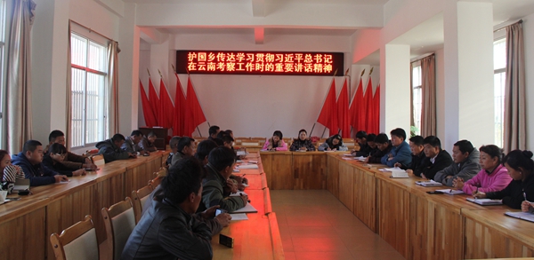 会上,乡党委书记尹兴华对后续进村入寨宣传学习进行了全面部署,并强调:宣传学习贯彻落实习近平总书记在云南考察工作时的重要讲话精神,是当前的头等大事,护国乡全体干部职工要结合自身工作实际,切实把习近平总书记的重要讲话精神贯彻落实到我乡的环境保护、基础设施建设、危房改造、扶贫、异地搬迁等工作中,并不断延伸到各个领域,进支部、进农村,确保把习近平总书记的殷切期望和最新要求传达到每一位党员。