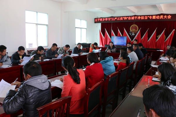 “三严三实”和“忠诚、干净、担当”是习近平总书记对党员干部的谆谆告诫,指明了新的历史条件下党员干部的修身之本、为政之道、成事之要,为加强党员干部党性修养、深入推进新形势下党的建设提供了重要遵循。王子树乡于2015年2月4日,组织和党员干部 “三严三实”和“忠诚、干净、担当”专题教育活动。活动由乡党委书记尚正实主持,全乡干部职工40余人参加了此次专题教育活动。
