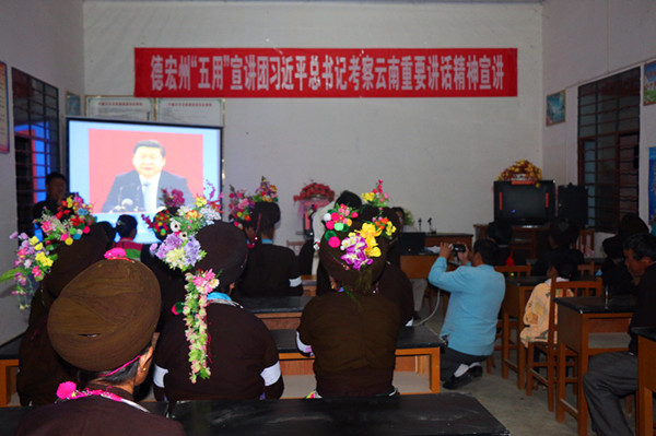 董老师用阿昌语作的开场白一开始就吸引了群众的注意力,通过通俗易懂的语言,生动鲜活的事例,深入浅出的讲解了习近平总书记提出的保持经济平稳健康发展、着力推进农业现代化、保护生态环境、推进民族团结和发挥基层党组织作用五个方面的要求。结合户撒乡生态环境优美、文化资源丰富、发展现代农业潜力大、民族和宗教信仰的多样性等实际情况,希望各族群众团结一心,积极配合乡党委政府保护好生态环境,努力发掘户撒优势,弘扬民族文化品牌,大力搞好经济建设和旅游开发,为建设小康社会贡献力量。