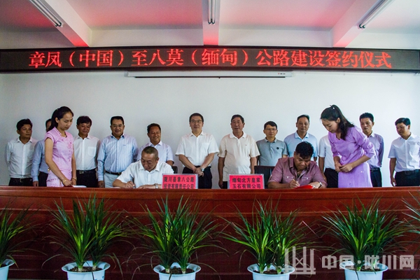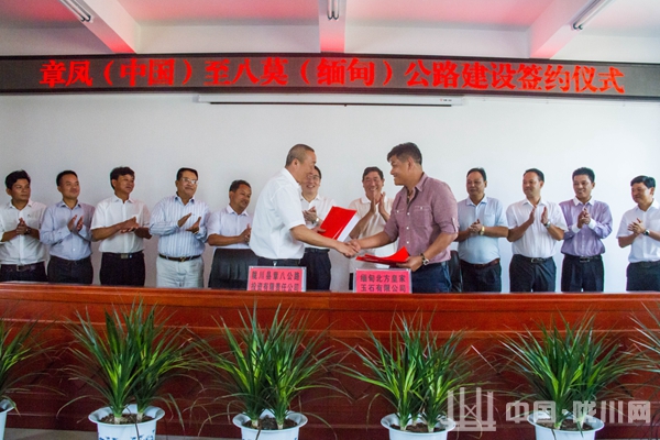 5月10日,陇川县举行章凤(中国)至八莫(缅甸)公路建设签约仪式。德宏州人民政府副州长苏洪涛、州政府顾问王兴明、陇川县委书记李林山、缅甸北方皇家玉石有限公司董事长吴腊散、副董事长吴腊昂等出席了签约仪式。