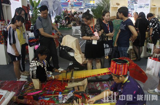 景颇织锦作为陇川的特色文化产业,在进行展览销售的同时,陇川的石玛丁和刀木办还在展馆内进行了现场织锦,很多顾客见到这一传统的民族纯手工技艺,纷纷拿起手中的相机进行拍摄,有些还合影留念。