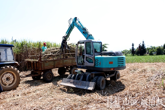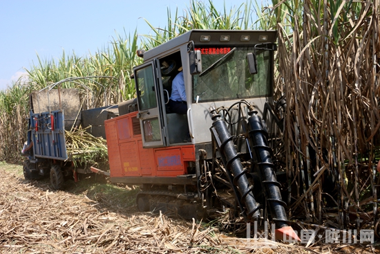 甘蔗产业是陇川农场管委主导产业,5月4日下午,整杆式甘蔗联合收获机在陇川农场陇把分场八队试运行。