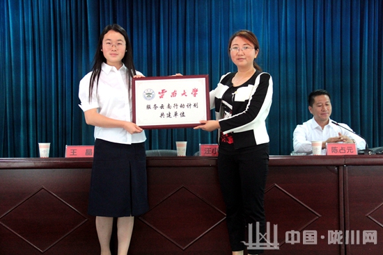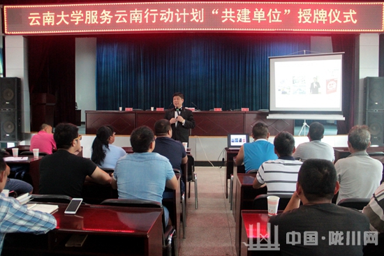 6月20日上午,云南大学服务云南行动计划职教“共建单位”授牌仪式在陇川农场管委隆重举行,这标志着云南大学服务云南行动计划项目“陇川农场学区”正式建立,云南大学将为陇川农场经济社会发展提供智囊咨询服务。