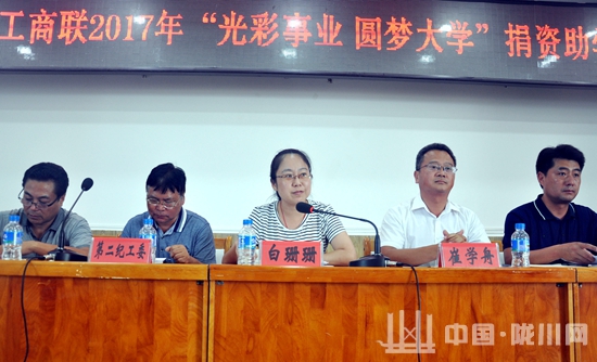 会上,白珊珊指出,今天我们在这里隆重举行“光彩事业·圆梦大学”捐资助学发放仪式,目的是进一步弘扬乐善好施、捐资助学的社会主义新风尚。通过举办这样的捐资助学仪式,把有限的社会公益资金无偿的捐给经济拮据的家庭,帮助考入大学的学子们渡过难关,让他们安心完成学业,同时感受社会大家庭的温暖,将来成为一个对社会有用的优秀人才;希望受资助的同学,珍惜这个难得的机会,不要辜负关心和爱护你们家人、老师和企业们的期望。要学会感恩,要更加勤奋学习,自强自立,在学校里做优秀学生,将来用自己的力量回报社会;县工商联认真履行职责,连续5年动员组织全县企业家和非公有制经济人士在为陇川县经济发展作出贡献的同时,积极参与助学助教的光辉事业,为党和政府分忧,为寒门学子解愁。