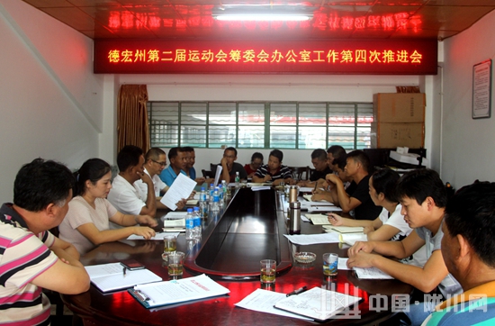 2017年10月11日上午,第二届州运会第四次工作推进会在陇川县体育运动中心召开,会议由州第二届运动会筹备委员会执行副主任、筹备委员会办公室主任、陇川县人民政府副县长陈玲主持。筹备委员会执行副主任、筹备委员会办公室常务副主任、州文体广电(新闻出版)局副局长王兴全,筹备委员会执行副主任、筹备委员会办公室常务副主任、州老年体协常务副主席杨旻,筹备委员会竞赛和场地器材处常务副处长、州文体广电(新闻出版)局竞青科科长周健康,筹备委员会办公室副主任、县文体广电旅游局局长彭权武及筹备委员会办公室全体成员参加会议。