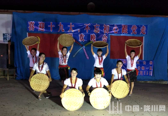 金黄色的党徽下,简陋的舞台上,翩翩起舞的演员笑脸盈盈。晚会在舞蹈《最美中国红》中拉开帷幕,一个个群众自编自演的歌舞陆续上演……一首《我的祖国》,让我们仿佛回到了那久远的年代;鲜艳的五星红旗,照耀我们火红的心,一首《我的中国心》一起分享这份荣辱与共的情感;五彩的梦想、绚丽缤纷、妙曼的舞姿,魅力四射,踏着欢快的舞步,合着动感的节拍,用震撼的音乐燃烧热情,舞蹈《彩帕飞舞》将晚会带到了高潮。节目《泼水欢歌》、《欢乐景颇山》、《景颇姑娘舂米舞》等展示了我们德宏少数民族的浓郁风情;来自陇把社区平均年龄50多岁的阿姨们带来的舞蹈《红红火火大中华》,表达了我们对生活的渴望、对未来的畅想;整台晚会现场欢歌笑语,掌声不断,精彩的文艺演出吸引了400多名群众到场观看。