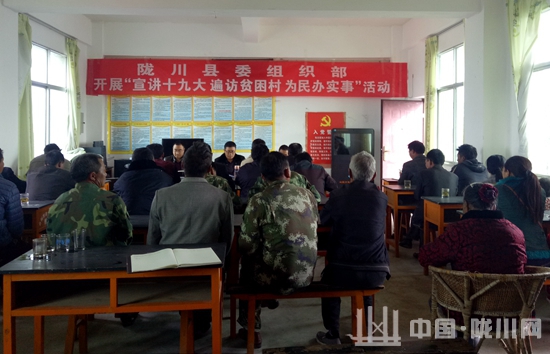 为深入学习宣传贯彻落实党的十九大精神和省委组织部要求在全省组织系统中开展“宣讲十九大、遍访贫困村、为民办实事”活动要求。12月27日下午、县委组织部副部长杨世春一行二人到王子树乡开展“宣讲十九大、遍访贫困村、为民办实事”活动。王子树村党员、那邦、岗巴、托盘山村班子成员共35人参加会议。