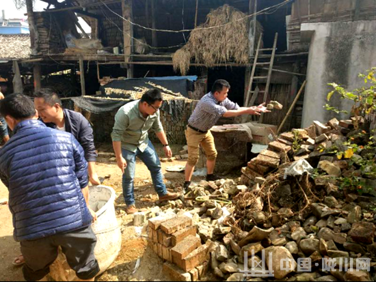 图为包组干部帮助帮扶户清理、打扫院落卫生