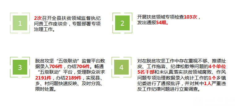 强力正风肃纪,为打赢脱贫攻坚战护航。研究制定了民房建设、纪律作风、扶贫资金、贫困人口动态管理等方面的督查方案,实行“每日督查和定期通报”制度,成立9个专项督查组,对基层乡镇干部和驻村工作队员在岗情况、工作进度、政策执行情况等进行“贴身”监督,开展专项检查103次,发出通报54期。对在脱贫攻坚工作中存在重视不够、推诿扯皮、工作拖沓、纪律松散等问题的4个单位5名干部和未认真落实扶贫领域腐败、作风问题专项治理数据录入统计工作的1个乡镇纪委进行了通报批评,并对其中1人严重违反工作纪律问题进行立案调查。