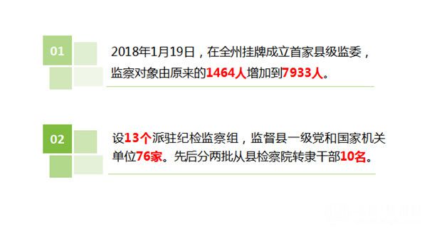 蹄疾步稳改革,监督体系建设更加完善。紧密结合实际,制定实施方案,绘制“施工蓝图”,架稳“四梁八柱”,倒推工期、挂图作战,在全州首家完成监察委员会组建挂牌工作,监察对象由原来的1464人增加到7933人。纪法协同,推动队伍和业务“嵌入式”融合,打造“纪检干部+转隶干部”的“混合兵种”,充分发挥各自的专业特长,实现优势互补、学用相长,“1+1>2”的改革成效逐渐释放。顺利完成派驻机构改革工作,设立派驻纪检监察机构13个,监督县级党和国家机关单位76家,实现了党内监督、国家监察全覆盖。