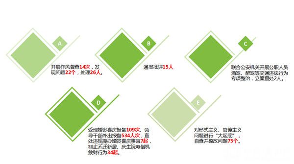 坚决惩贪治腐,巩固反腐败压倒性态势。建立“节前督查、节后抽查、通报曝光”长效机制,对乡镇和县直部门进行随机抽查、明察暗访,紧盯“四风”新形式新动向,累计开展作风督查14次,发现问题22个,处理26人。严肃整治少数干部庸懒散慢、工作推动不力、主体责任履行不到位等问题,通报批评15人。联合公安机关开展公职人员酒驾、醉驾等交通违法行为专项整治,立案查处2人。规范婚丧嫁娶和领导干部外出报备事宜,受理婚丧喜庆报备109次、领导干部外出报备534人次,查处违规操办婚丧喜庆事宜7起,制止乔迁新居、庆生祝寿借机敛财行为34起。严格对标中央要求,对形式主义、官僚主义问题进行“大起底”,自查并整改问题75个。