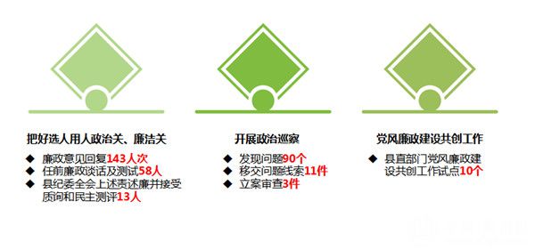 强化政治担当,围绕中心任务履职尽责。制定下发了贯彻落实州、县纪委全会部署任务的分解方案,将“两个责任”分类细化,作为各级党组织及其主要负责人和班子其他成员履行主体责任、各级纪检监察机关履行监督责任的具体内容。13名乡镇、部门党政主要领导在县纪委全会上述责述廉并接受质询和民主测评,对乡镇(农场)党委、纪委和县直主要负责人落实全面从严治党情况进行约谈,对落实“两个责任”不力的2个单位进行诫勉谈话,对58名新任领导干部开展任前廉政法规测试和谈话,作出廉政意见回复143人次。对4个乡镇、3个县直部门开展了政治巡察,发现问题90个、移交问题线索11件,立案审查3件。选定10个县直部门作为党风廉政建设共创工作试点。
