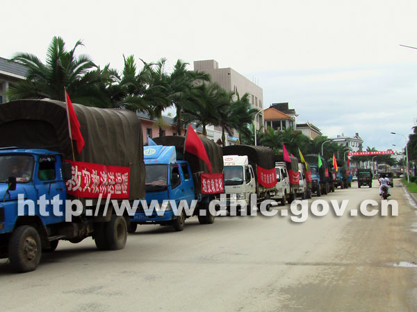 随着隆隆的车辆发动机声响,9辆满载救灾救济粮的大型车队在民政局救灾救济车的开导下,驶出民政局场院,使过县政府大楼,直奔全县各个乡(镇)随之发放到灾民困难缺粮户手中。