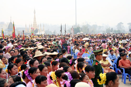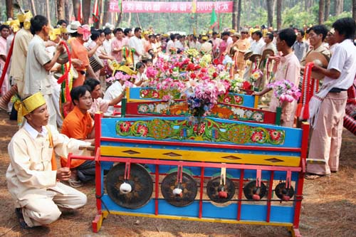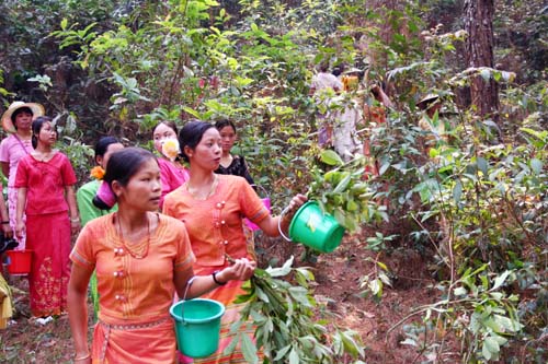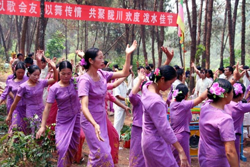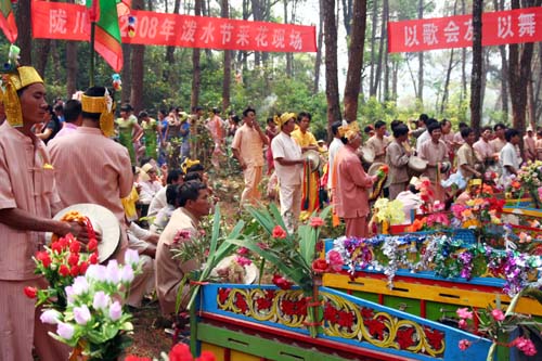 11日,数千名干部群众齐聚景罕广母,一场声势浩大的采花活动拉开序幕。采花现场,村村寨寨的各族群众身着节日盛装,各显身手,他显鼓技,你摆舞姿,我亮歌喉,刹时间,鋩锣声、象脚鼓声、山歌声响彻山谷,变化多姿的嘎秧舞犹如数条彩龙穿梭与广母山中,昔日宁静的广母山完全变为歌舞的海洋,这与其说是民族大联欢,倒不如说是一个和谐的大家庭在过大年。