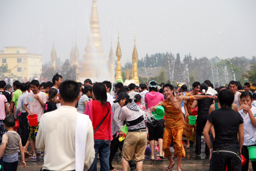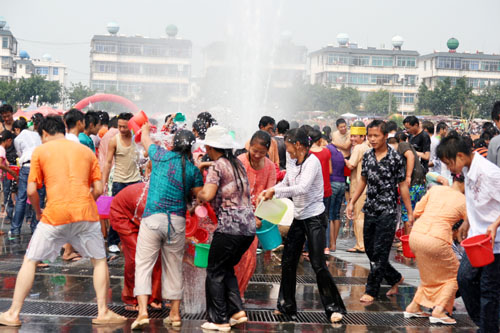 12日上午9时,泼水狂欢活动开幕式在民族文化广场隆重举行。随着县委书记杨世庄一声“陇川县2008年泼水节,开幕!”整个广场顿时礼花齐放,鞭炮齐鸣,吉祥水花四起,身着节日盛装的各族干部群众,远道而来的各位来宾,各县(市)祝贺团,不由自主地加入到长龙般的嘎秧队伍中,以片片水花传达出彼此最真挚的祝福。广场上,四起的水花,悠扬的鼓声,此起彼伏的欢笑声,变化多姿的翩翩嘎秧舞,编织出一副有声有色的动感图案,编织着陇川的美好明天。