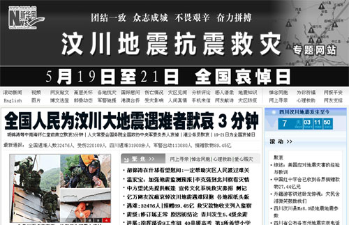 新华网“汶川地震抗震救灾”专题网站整合文字、图片、视频、直播、访谈、论坛、博客、短信、手机报、flash等20多种网络传播形式,通过网上寻亲、心理救助、爱心赈灾、向遇难者志哀、为抗震救灾支招等互动栏目,为广大网民提供参与抗震救灾、支援灾后重建、奉献智慧力量的渠道。人民网“抗震救灾官网”包括新闻区、救助互动区、公益服务区、资料知识区四大板块,开设实时报道、救援行动、抗灾英雄谱、第一现场、网友寄语、网上求助、救援手册、手机传爱心等30多个子栏目。央视网“中国汶川抗震救灾网”发挥视频优势,设立抗灾纪实、灾情汇总、自救攻略、防疫手册、历史借鉴、爱心捐助、我们在一起、我们感恩、短信推送、中国汶川抗震救灾网上纪念馆等20多个栏目。三个网站都设立中文版和英文版,并与手机新媒体互动,成为传送党和政府声音、传递网民关切、服务灾区生活、反映重建工作进展的网上平台。