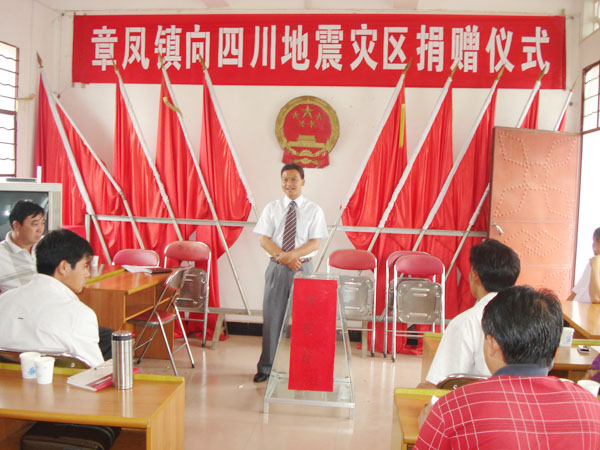 镇长姜晓回率先捐款,他揪心的说:“每天回家打开电视,看的都是来自四川地震灾情的最新报道,一桩桩、一幕幕,无家可归的人们和不断攀升的伤亡数字,以及灾区的残垣断壁的情景,无不让人忧心不断,不知道我的眼泪流了多少,伸出自己的双手,献上一份爱心,自己做的也只能是这些了”。镇班子领导干部职工纷纷响应踊跃捐款。因病当天早上未能参加捐赠仪式的办公室小赵,下午也托人将捐款送到办公室。60多岁的退休老干部李绍忠,几次打听捐款的具体时间,19日早早的就来到捐赠现场,对笔者说:“四川的灾区令人牵挂,一方有难八方支援,今天献了爱心,也了了我的一桩心愿,只希望灾区人民在举国上下的支持下,能挺过难关”。