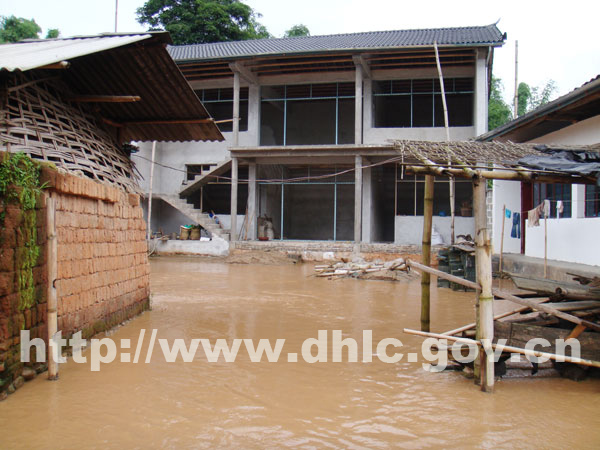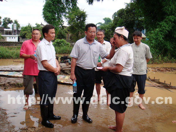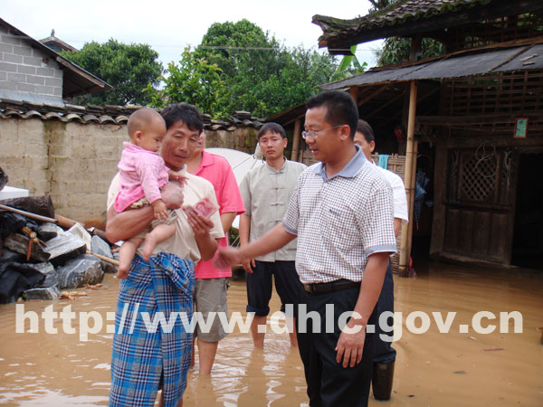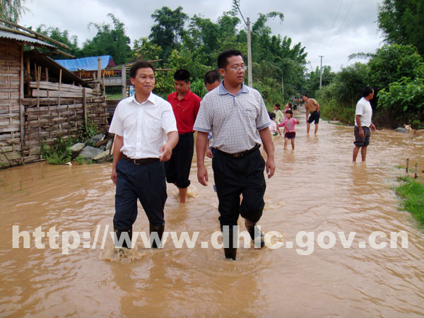 当李正环一行赶到拉相村时,村内道路已被洪水淹没,部分群众家中已变成一片汪洋,村民们正在忙着抢救受灾物资,有的群众采取果断措施在门家口设置了麻布口袋防止洪水流入家中,有的群众则在工作人员还未到来时,已及时撤离了到安全地带。在得知傣族群众老项家因洪水冲入屋内,墙体四面渗水,已不能居住时,李正环十分挂念老项及家人的生活情况,亲自到老项家中进行了慰问,并为他家送上慰问金。得知县长来看望大家,拉相村的村民们聚集在李正环身边, “近期虽普降暴雨,但不会造成较大的灾情,县委、县政府已采取了相关措施,启动了抢险救灾应急预案。灾情发生时,请大家不要慌,要听从相关人员的安排,安全有序地撤离到安全地带等待救援”李正环这样对受灾群众说到。