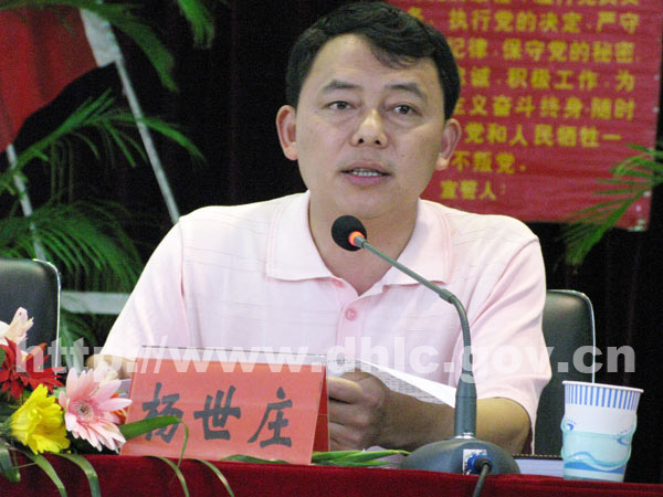在热烈的掌声中,县委书记杨世庄发表重要讲话。他首先代表县委、县政府向全县各级党组织和广大共产党员致以节日的问候!向受到表彰的先进集体和个人表示热烈的祝贺!