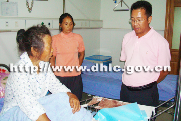 何会兰老人在“8?21”地震中受伤后,护国乡政府于当晚及时把老人送到了州医院,院方比较重视专门派出骨干医生为老人看病护诊,经医院诊断为左脚踝粉碎性骨折。发生地震的当天,李县长接到报告后,对何会兰老人的伤情比较关心,由于陇川震情严重,要指挥协调全县的防震救灾工作,不能前去看望,安排乡上以最快的时间,把何会兰老人送到医疗条件较好的医院进行治疗,委托乡上代表县长带去了对老人及家属的关心问候。